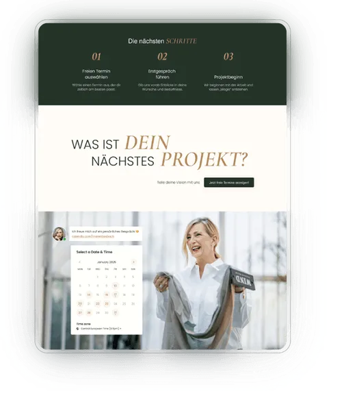 Eine zielgruppenspezifische Webseite mit sofortigem "Magic-Moment" leitet Besucher intuitiv durch dein Angebot, vermittelt Expertenstatus und wandelt Interessenten in Kunden um.