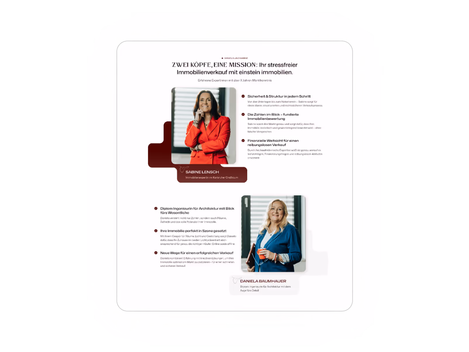 Die Profilbesucher gingen 300 % öfter auf die Webseite, ihre Terminquote verdoppelte sich. Maren kommuniziert nun ihren Wert klar und schlägt sich nicht mehr Preisverhandlungen rum. Aktuell entsteht eine neue Webseite, die das weiter unterstützt.